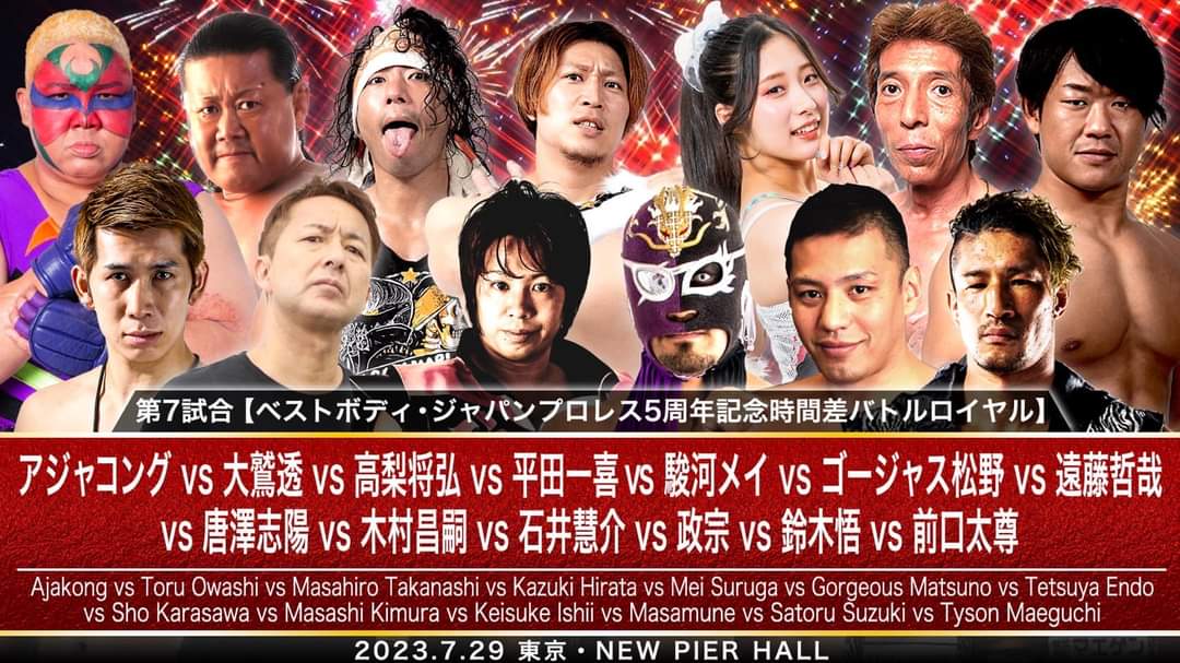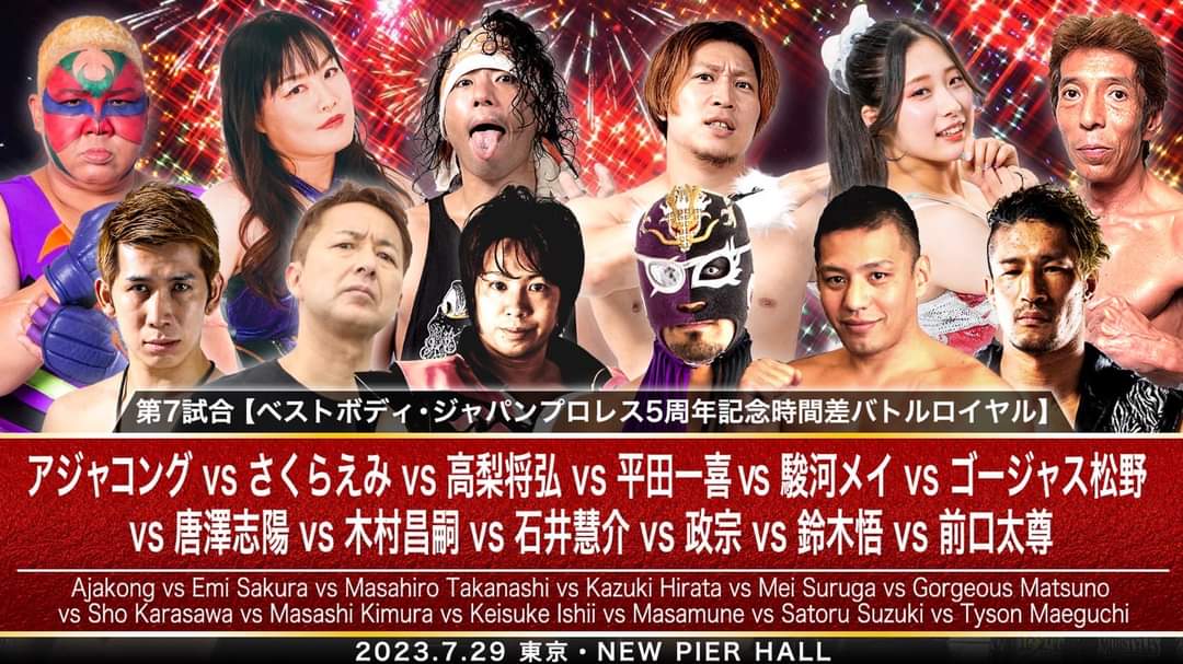 私の試合は、アジャコング vs さくらえみ vs 高梨将弘 vs 平田一喜 vs 駿河メイ vs ゴージャス松野 vs 唐澤志陽 vs 木村昌嗣 vs 石井慧介 vs 政宗 vs 鈴木悟 vs 前口太尊のベストボディ・ジャパンプロレス5周年記念時間差大バトルロイヤルでした。