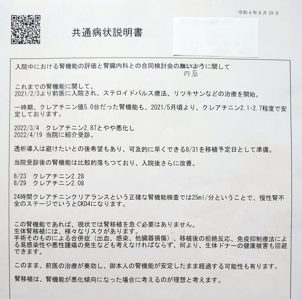 延期後、福島医大の腎臓内科と新潟大学病院の泌尿器科で治療と経過観察を続けておりますが、現在腎機能の数値が若干改善方向で横ばい状態をキープしております✌️