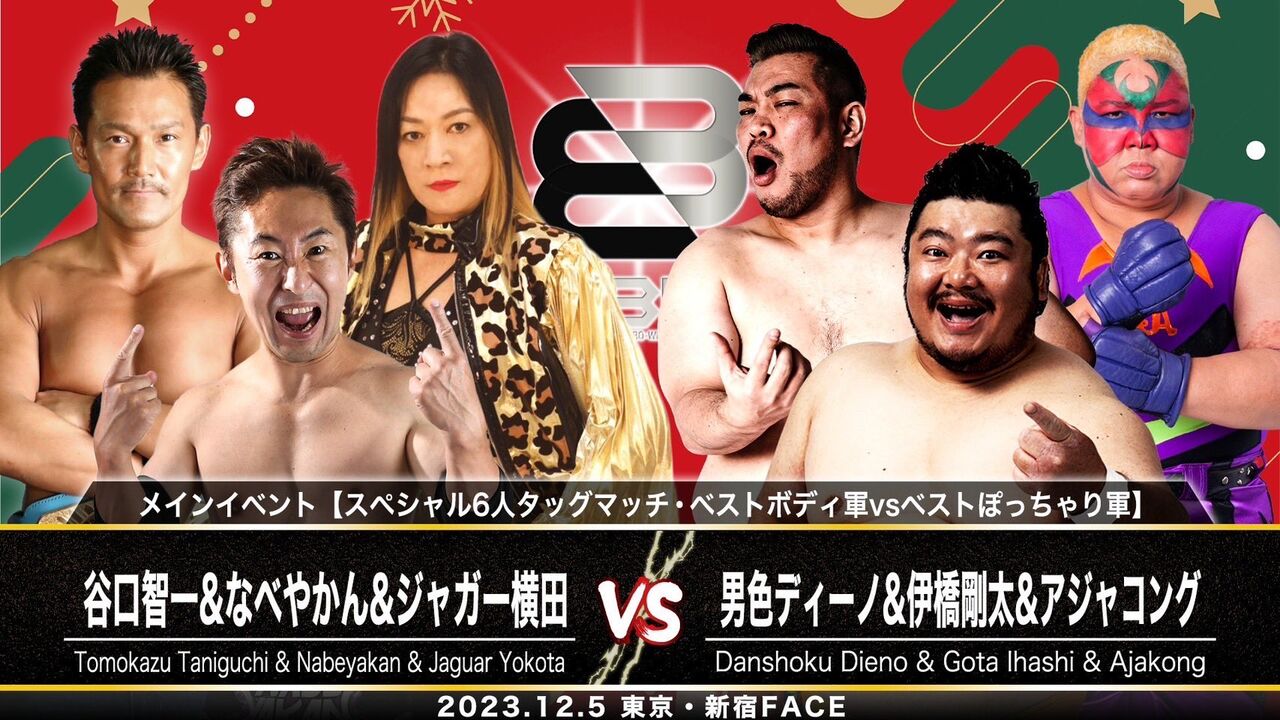 ❨ベストボディ軍❩谷口智一&なべやかん&ジャガー横田(ディアナ) vs ❨ベストぽっちゃり軍❩男色ディーノ(DDT)&伊橋剛太(DDT)&アジャコング(超花火)