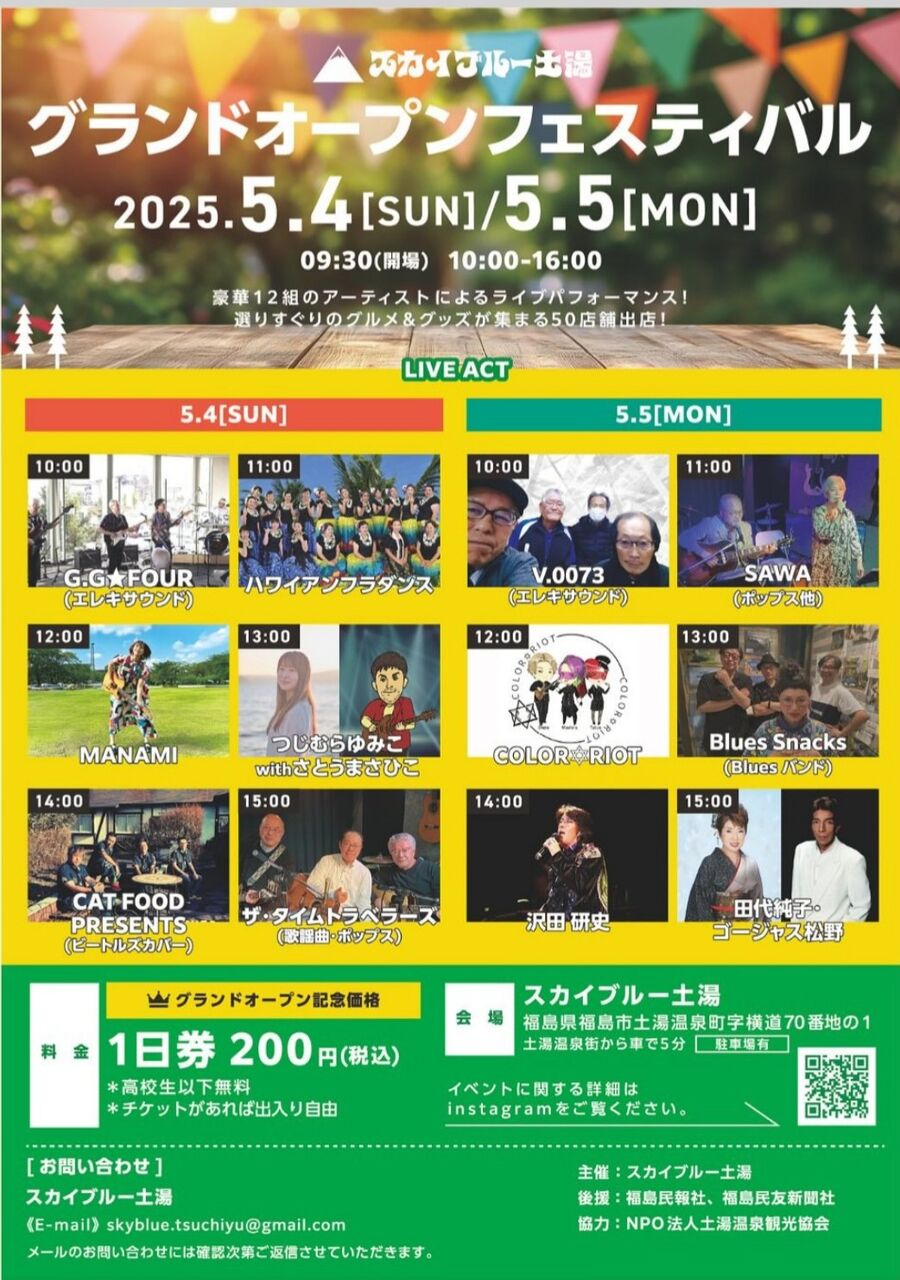 明日、スカイブルー土湯様のグランドオープンフェスティバルに出演させて頂きます✨