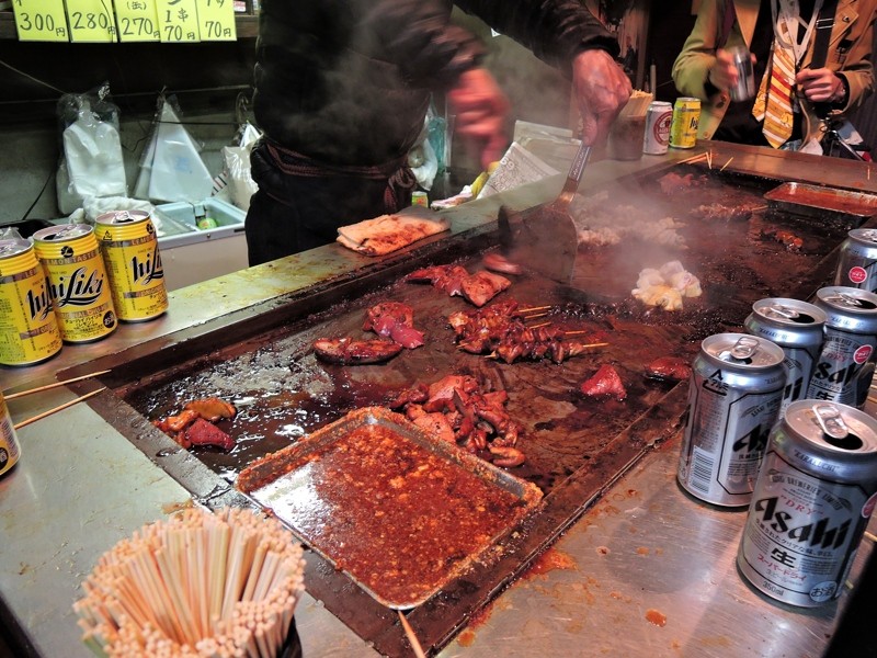同じ鉄板で焼かれたホルモンを皆で食います。美味いし、安いんです。