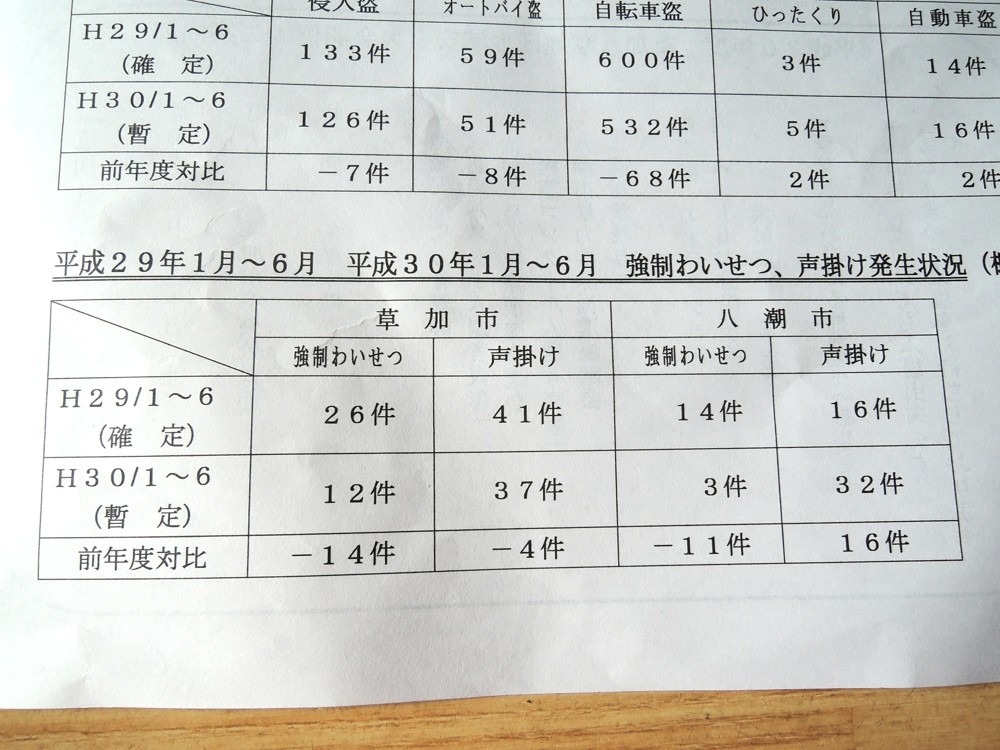 明らかに八潮の方が少ないことが分かります。また昨年に比べて改善傾向にあることも理解出来ます。草加市の人口が約25万人に対して、八潮市がもう少しで10万人ですから、去年上期の強制わいせつの発生率は、ほぼ同じということになりますね。今年に至っては、八潮の強制わいせつ事件は激減しています。