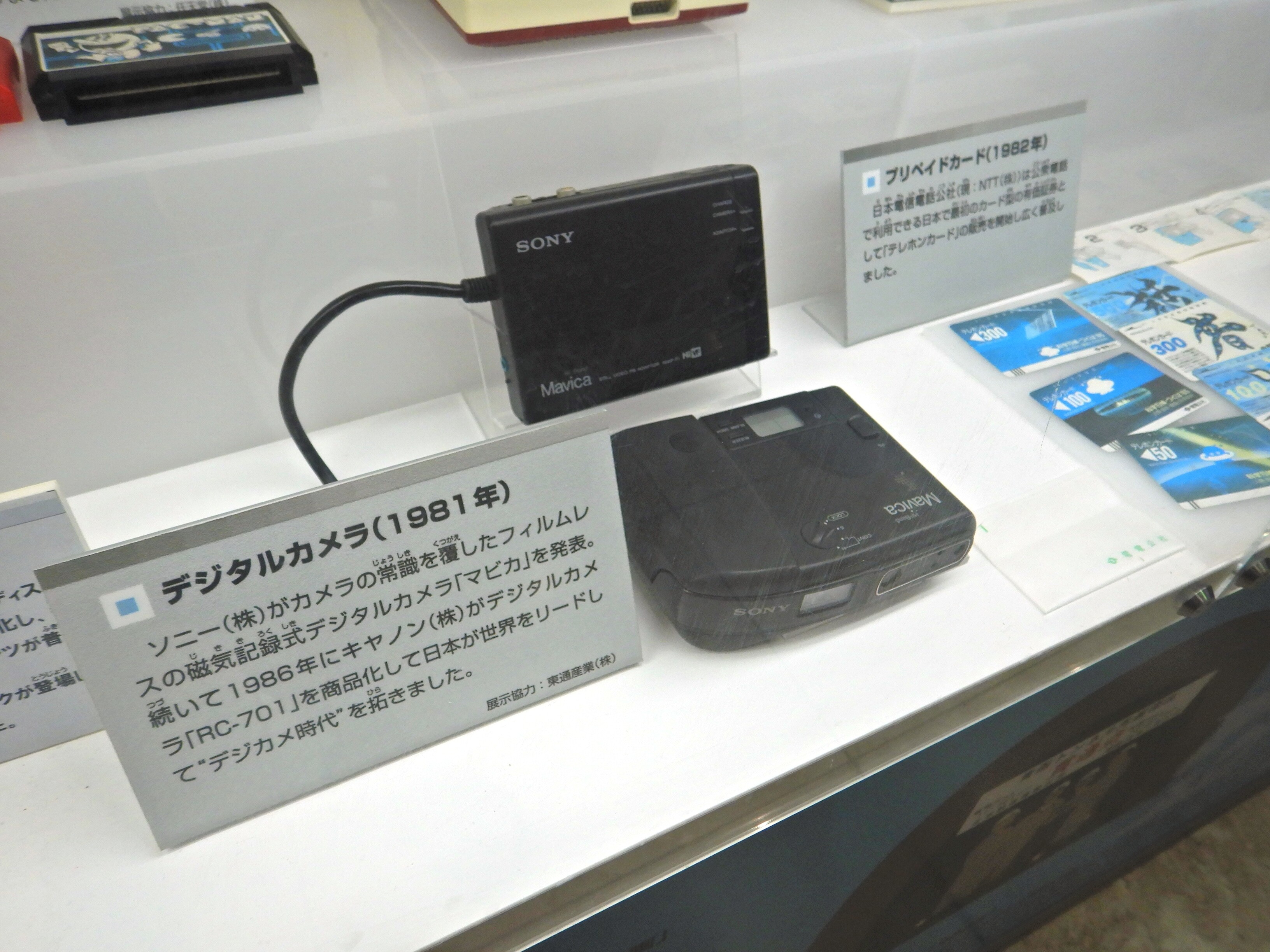 注:この説明書きの大半は誤りです。1981年に発表されたのはマビカの試作機で、写真に写っているMVC-C1の発売は1988年で、80年代のマビカはいずれもアナログ記録方式なのでデジカメではありません。当時は電子スチルカメラと呼ばれました。アナログのマビカは、販売的には完全に失敗でしたが、この技術が後のデジタルカメラ(サイバーショット、デジタルマビカ)に発展します。