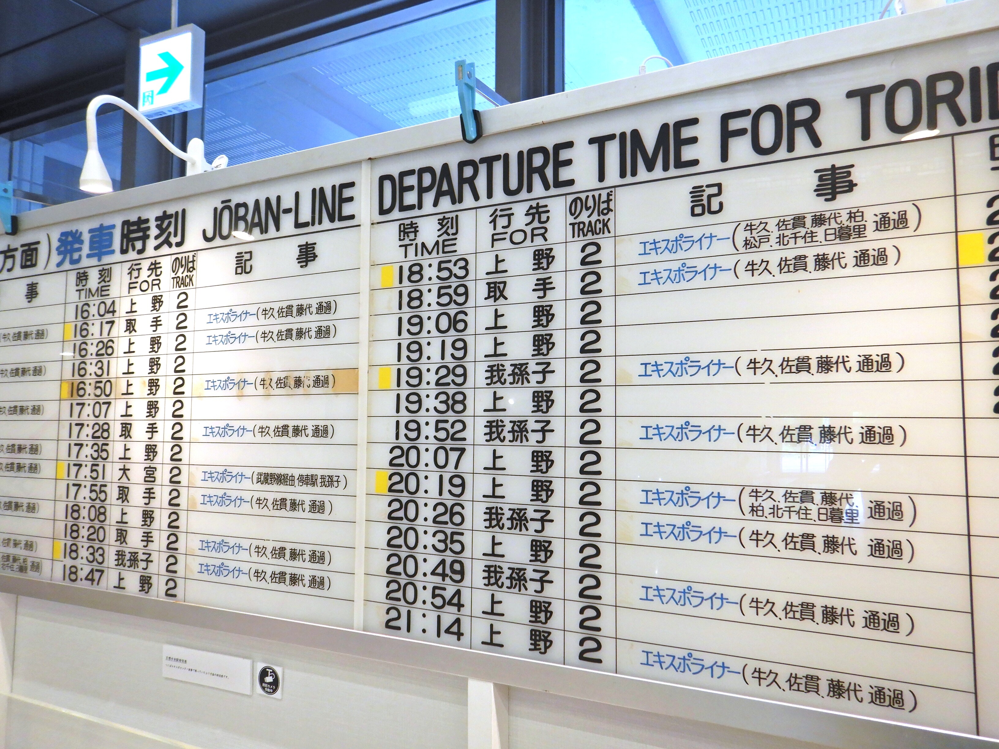この時刻表は当時見たはずですけど、当然記憶にはありません。たまに松戸、北千住通過のエクスポライナーがありますね。一昔前に常磐線特別快速が北千住を通過するようになって驚きましたけど、昔からそういう電車はあったんですね。