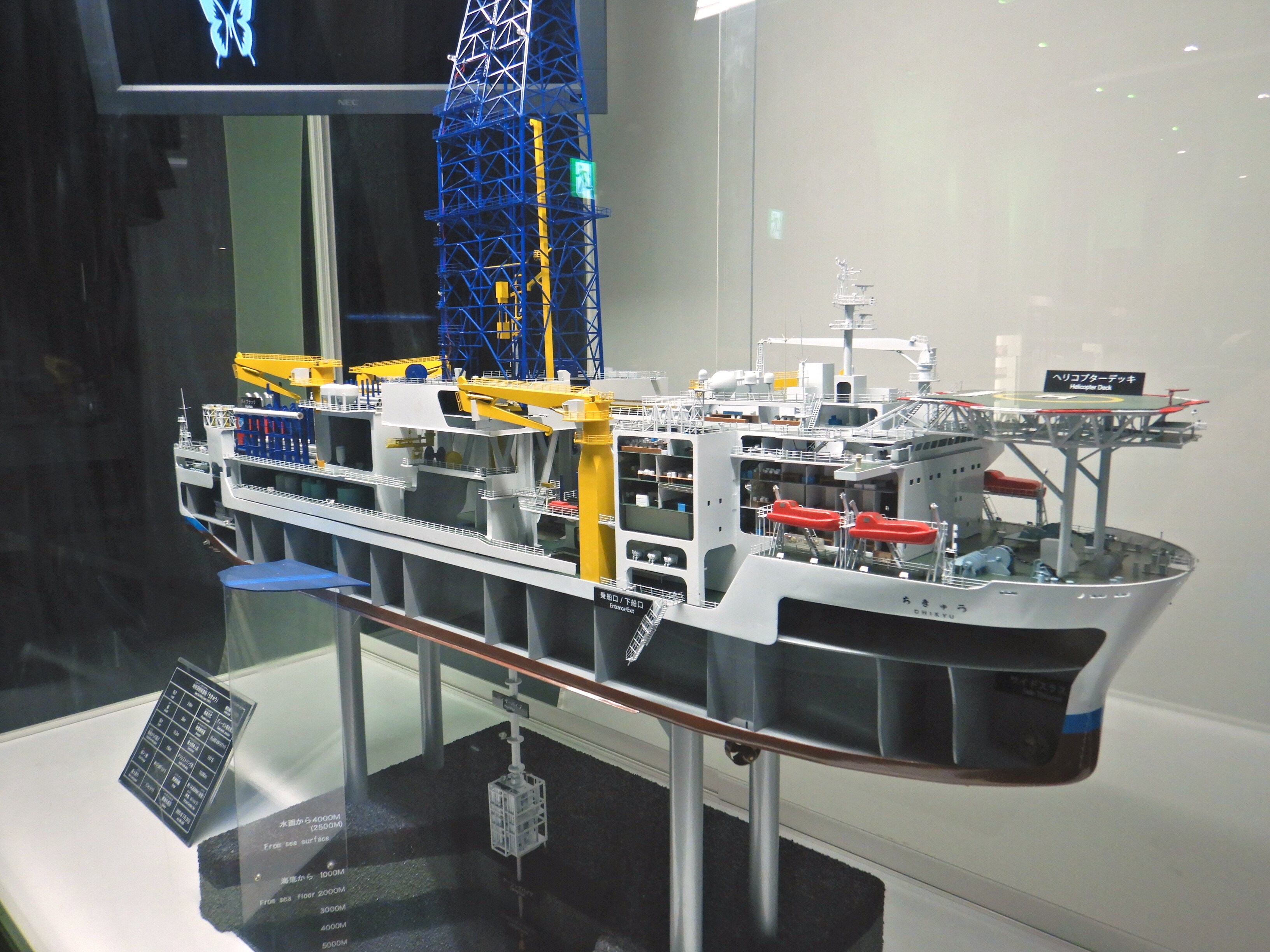 この模型を見て、ちきゅうの素晴らしさを初めて感じました。船橋とヘリ甲板の位置関係とか激ヤバですよ。何だか、昔の戦闘空母みたいです。