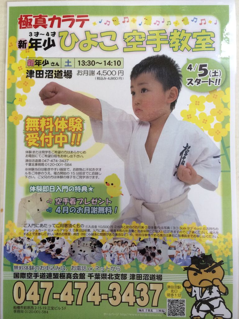 4/5(土)より、年少さんのクラス「ひよこ空手教室」が、津田沼道場にて始まります!