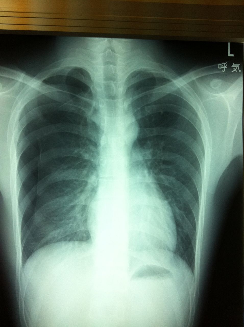 画像右側の正常な肺に対し左側には漏れた空気の空間があります、
