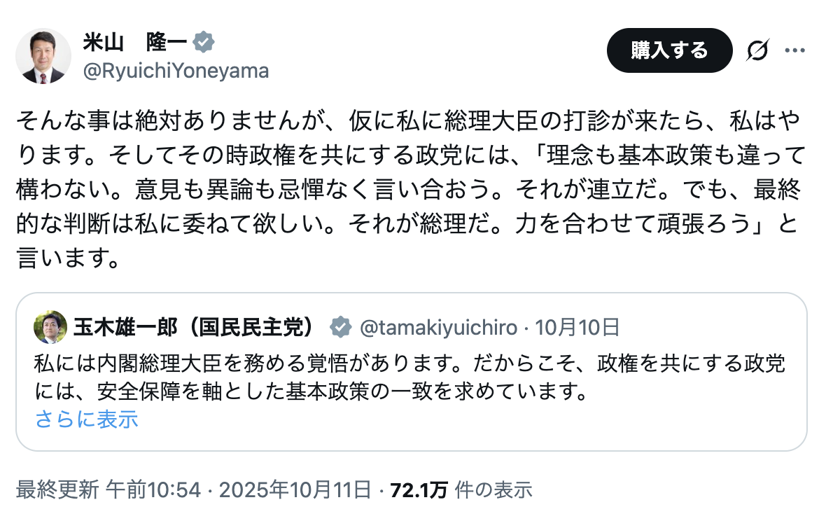 — 米山 隆一 (@RyuichiYoneyama) October 10, 2025