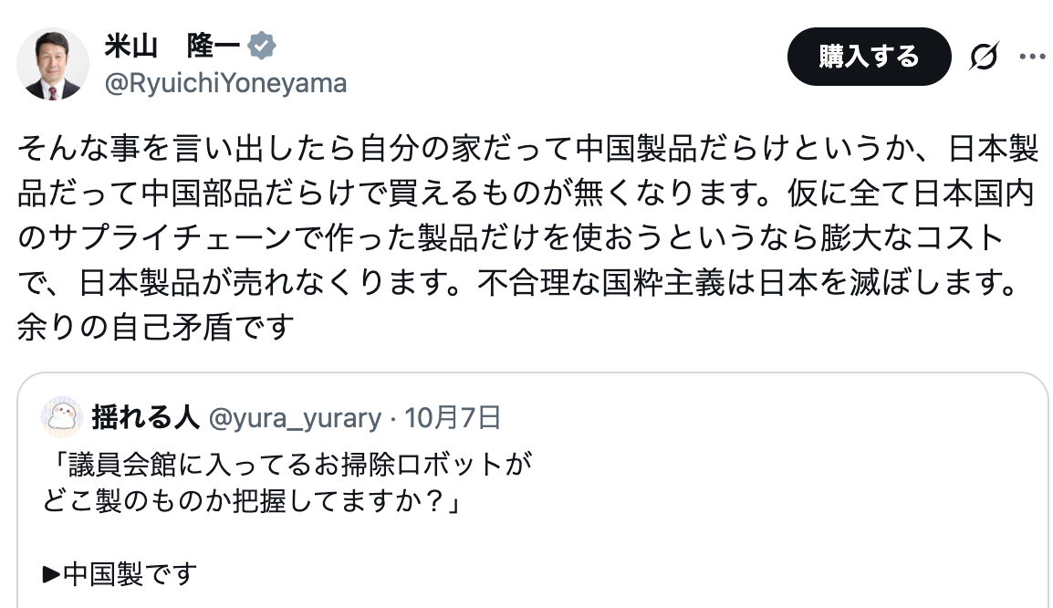 SNS上で拡散している、自民党の小野田紀美参院議員が議員会館のロボット掃除機の製造国と安全保障の観点からの調達基準を指摘する動画について、立憲民主党の米山隆一衆院議員が2025年10月10日にXで反応。「不合理な国粋主義は日本を滅ぼします」と異論を唱えた。