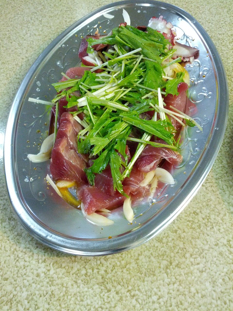 豚肉に、越中のこうじ味噌をからめたものや、かつおのお刺身。