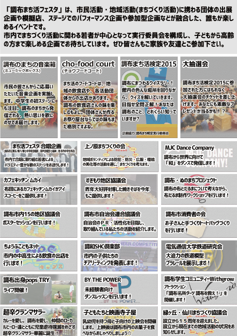 多世代の誰もが楽しめるイベントとして「調布まち活フェスタ」を実施します。