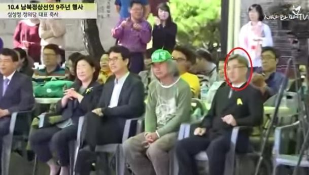 ドゥルキングと推定される人物が、2016年10月3日「10・4南北首脳宣言9周年行事」で、沈相ジョン正義党代表と柳時敏元保健福祉長官、緑の党の関係者と並んで最前列に座っている様子。赤い丸の男性がドゥルキングと推定される。