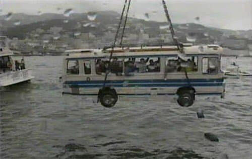 海の上でバスに芸能人を乗せて、問題を間違える度に少しずつ下降。