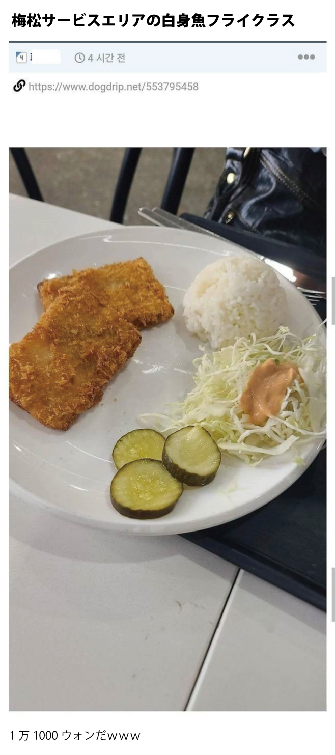 韓国のネット掲示板イルベに「梅松サービスエリア11000ウォンの白身魚フライクラス.jpg」というスレッドが立っていたのでご紹介。