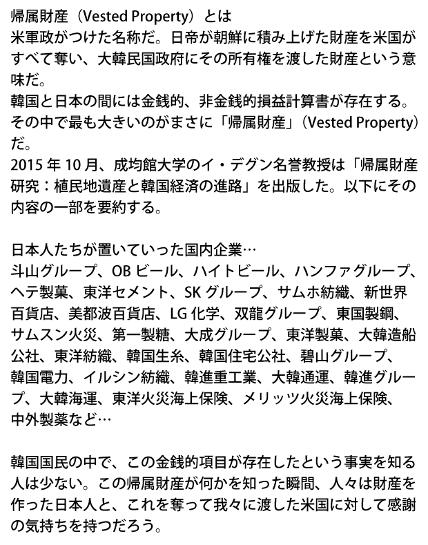 敵産(日本人が韓半島に残した財産)は莫大で、米国は戦争賠償金として使おうと考えたが、李承晩がマッカーサー将軍と交渉した末、韓国に帰属することになった。