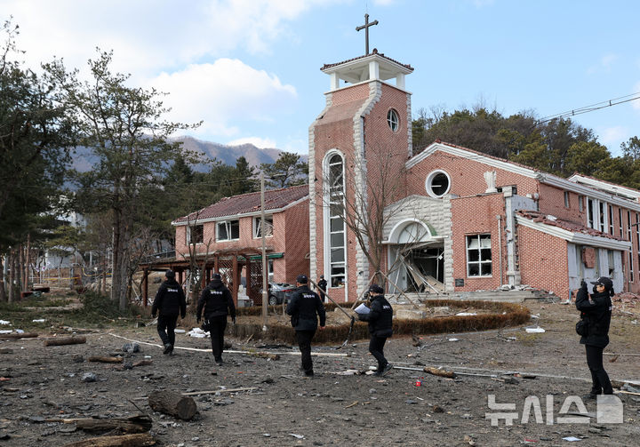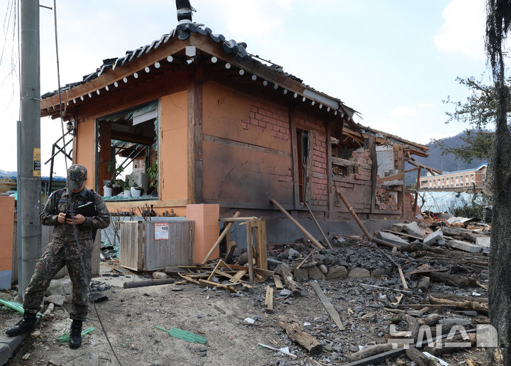 6日午後、京畿道抱川市二東面蘆谷里の空軍戦闘機爆弾誤発事故現場が統制されている。2025年03月06日