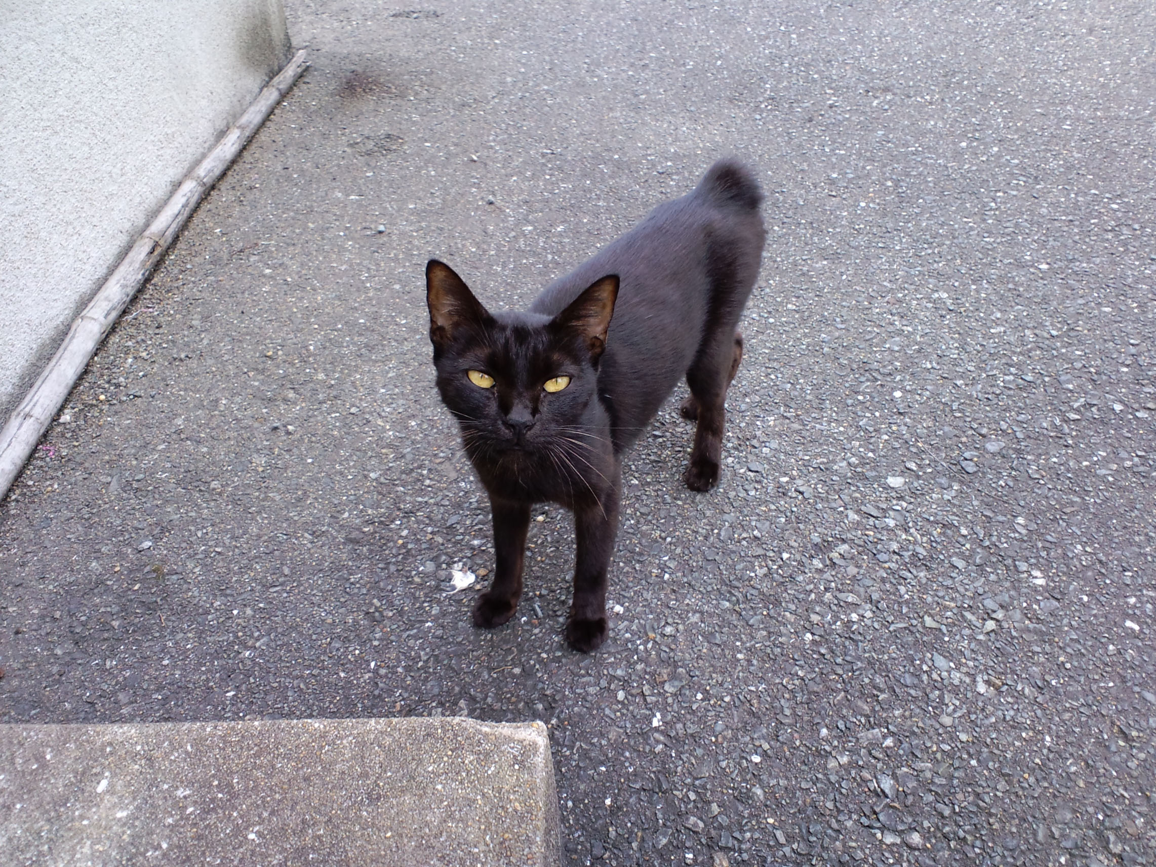 どこからだろうと思って探してみると車と車の間に黒猫が隠れていた。