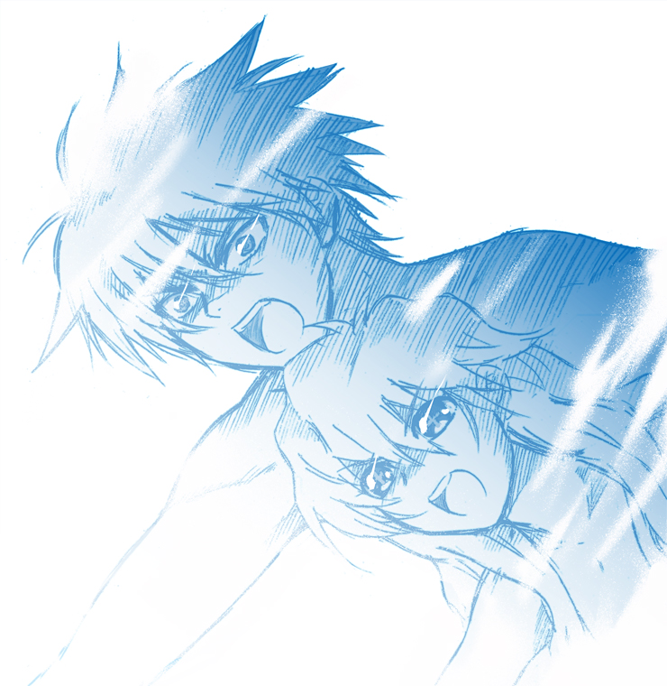 ↑前回同様もいっちょ過去絵から、貧血ダウン陽介(P4)。バナナマンの朝礼コントのオチ風に、倒れざまに不可抗力でガバッと。