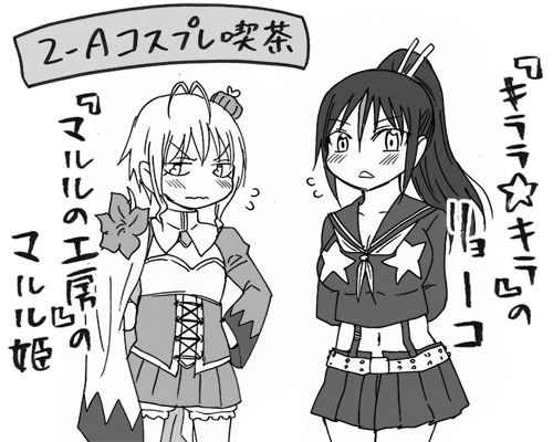 オタクキャラのブリサの提案により、靄子は『キララ☆キラ』のリョーコの、香澄は『マルルの工房』のマルル姫のコスをそれぞれ着用しています。