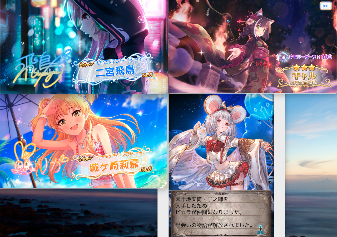 僕のご報告というと、正月ガチャが軒並み豪運だったくらいですね。『デレステ』は60連でフェス限飛鳥とフェス限莉嘉をお迎え、『プリコネ』は無料石80連で正月キャルお迎え、『グラブル』も無料石80連でビカラお迎え......良いお年玉をサイゲームスから頂きました。ありがたい!