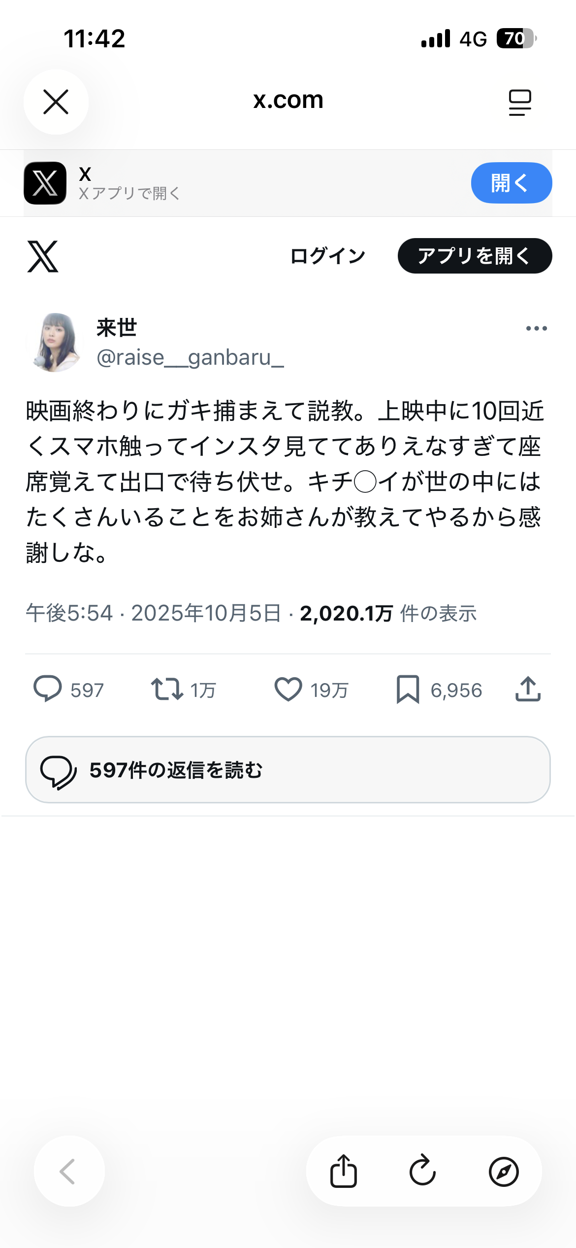映画終わりにガキ捕まえて説教。上映中に10回近くスマホ触ってインスタ見ててありえなすぎて座席覚えて出口で待ち伏せ。キチ◯イが世の中にはたくさんいることをお姉さんが教えてやるから感謝しな。