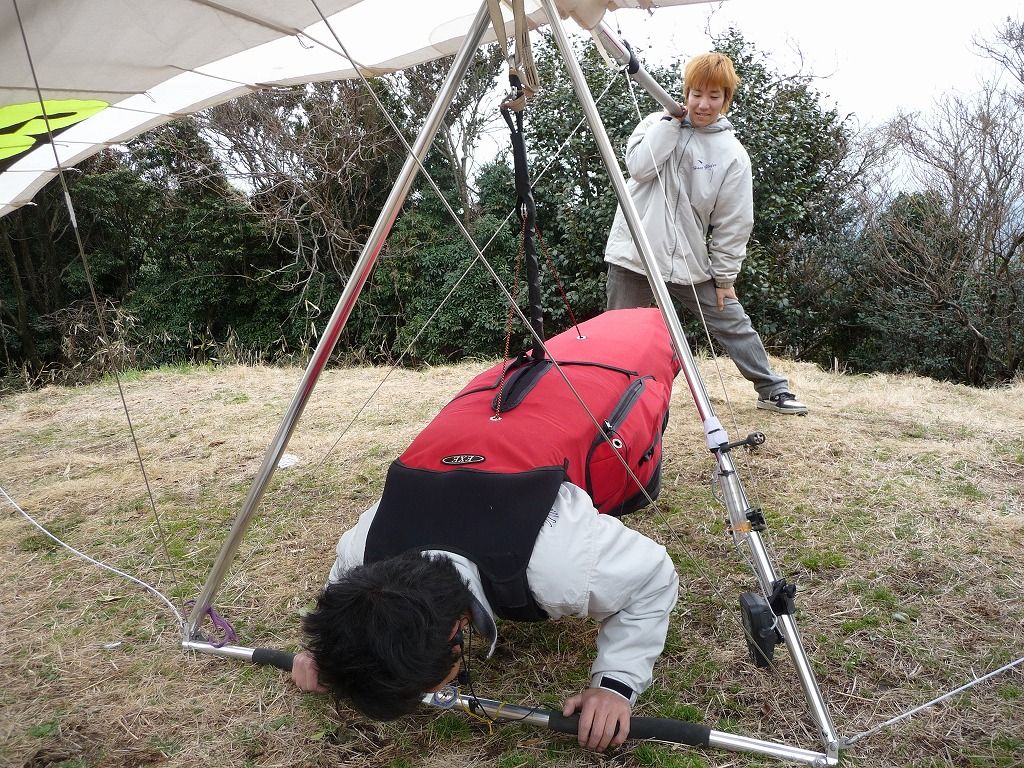 晴れることを祈りつつセットアップ.そして先陣をきって江がテイクオフ.