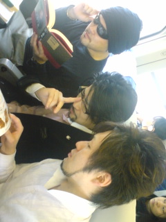 写真は新幹線の中で真剣に読書をしている柿さんと、真剣に話し合いをしているうっちーさんとオレです☆