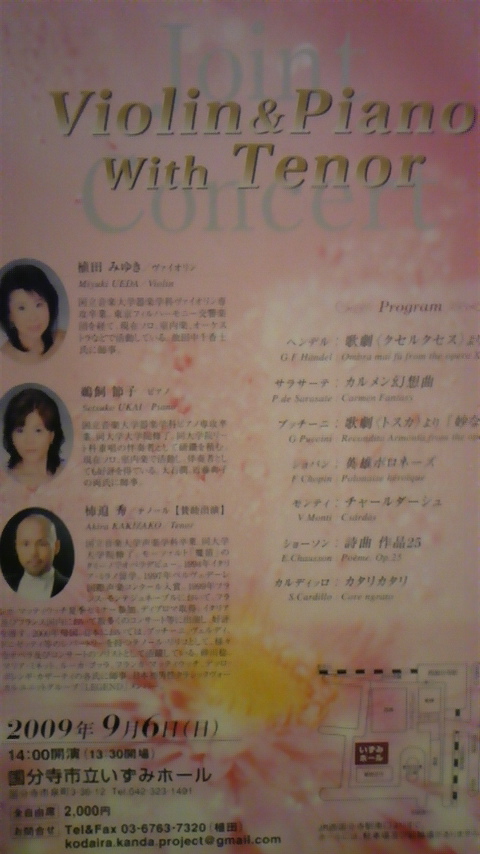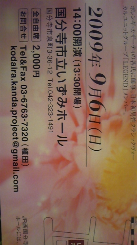 来週の9月6日の日曜日、お昼14時から『レジェンド』発祥地西国分寺いずみホールにてバイオリン&ピアノwithテノールでコンサートがあります(^O^)