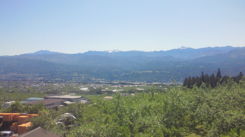 南アルプスの山々が雲ひとつない青空に映え、高い山にはまだ白い雪が見えます。
