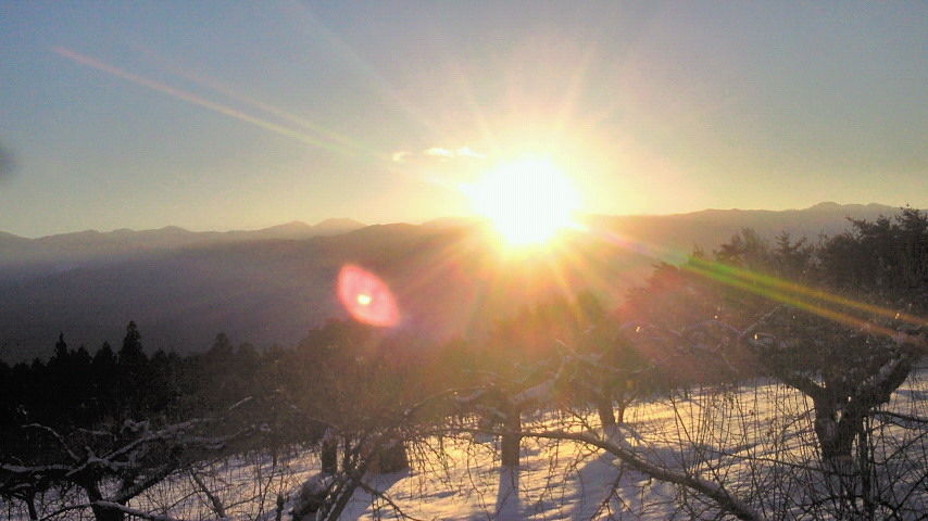 南アルプスの峰々を照らしながら顔を出したおひさまを拝んで、今年の家内安全・五穀豊穣をお願いしました。