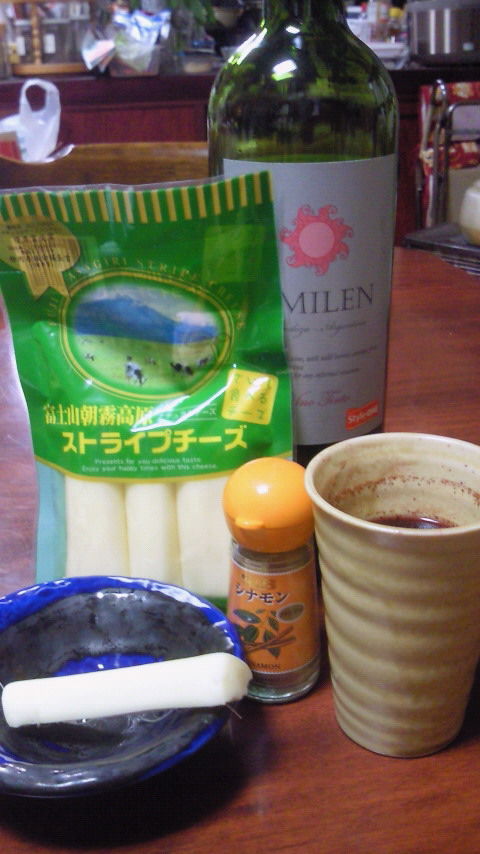 チーズをつまみにホットワインここのところホットワインがお母ちゃんのマイブームなのですが、今夜のおつまみはきょういただいた朝霧高原ミルクランドのストライプチーズです。