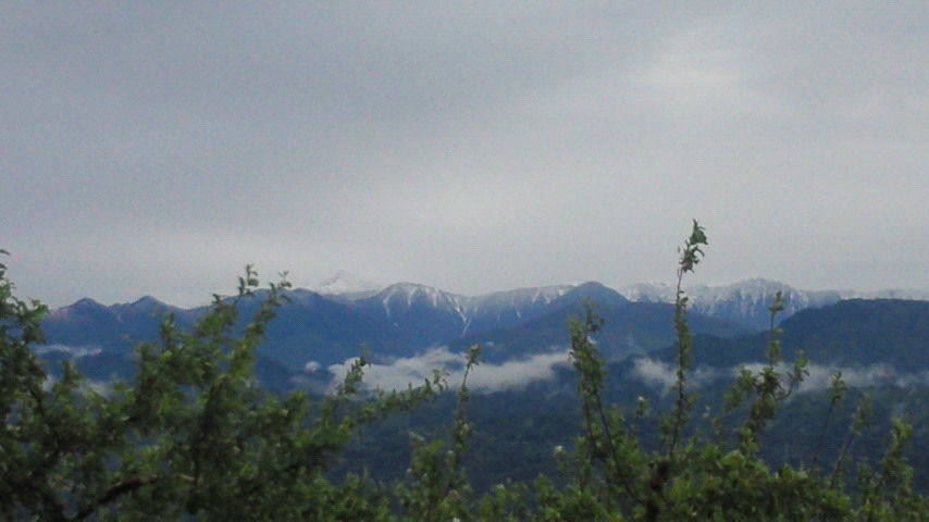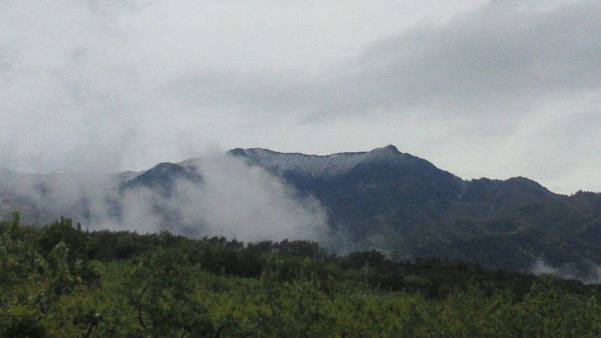 昨日からの雨が上がり、やけに寒いなあと思ったら、南アルプスの高い山々が雪で白くなっていました。
