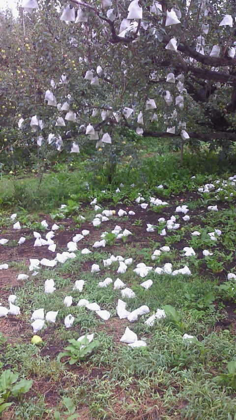 袋をかけた洋梨が落ちて真っ白です。