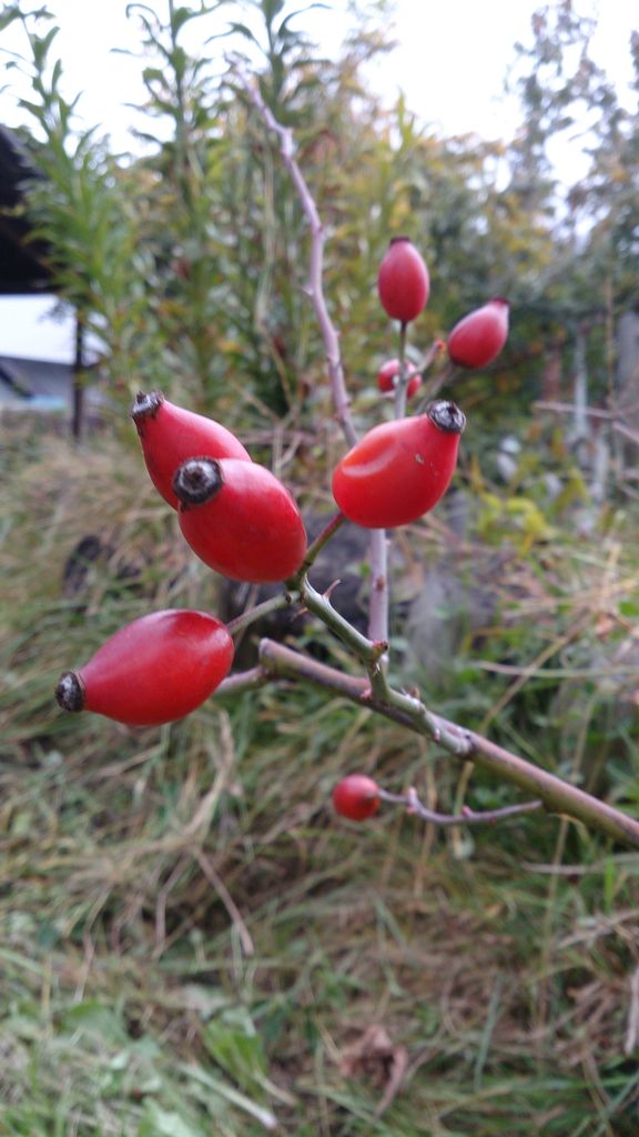 ローズヒップ花盛りを終えたバラがきれいな赤い実をつけています。