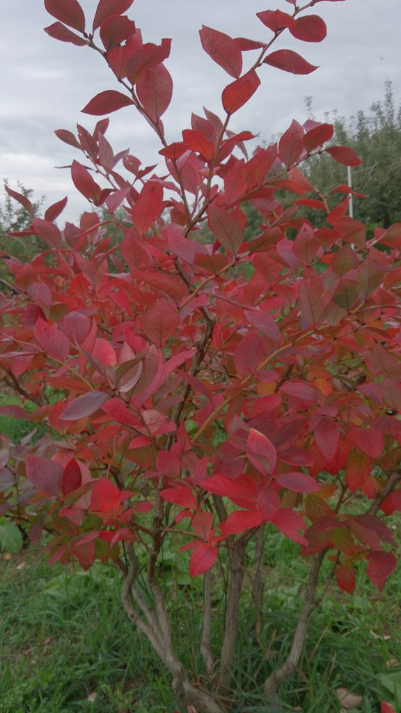 ブルーベリー紅葉りんごの葉がまだ緑色の果樹園の中、ひときわ目を引く赤い樹はブルーベリーです。