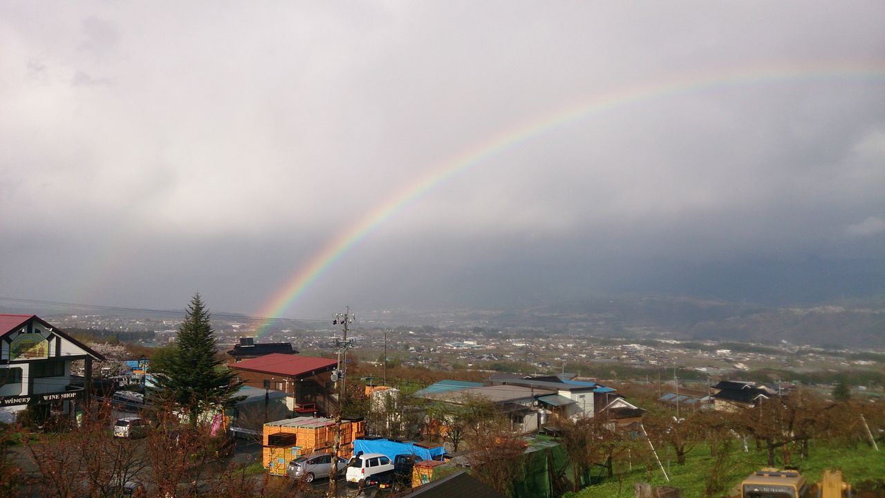 DSC_1085雨ばかりで雷とどろき雹が降った昨日の夕方、雨上がりの空にまるで伊那谷をまたぐように大きな虹が出てました。
