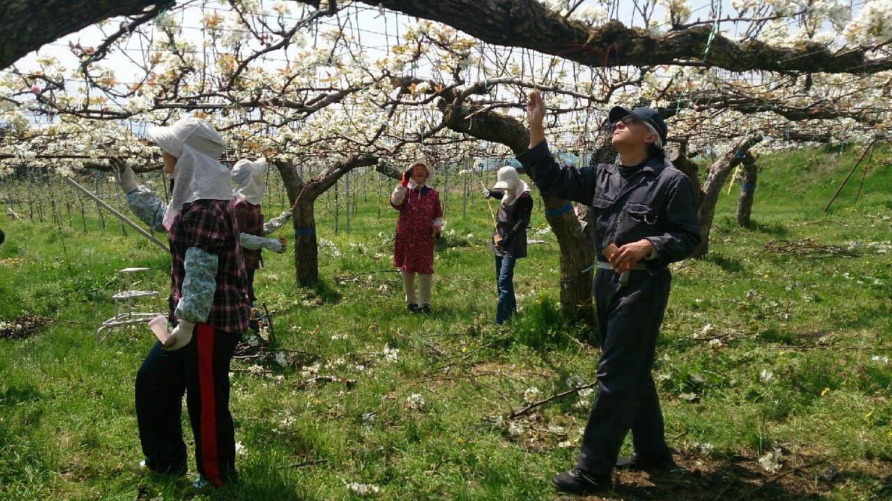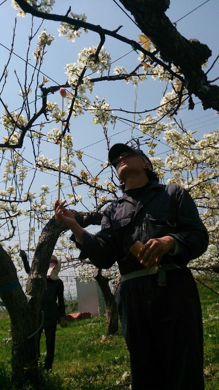 今松川町の果樹園では梨の受粉用の花取りの真っ最中です。