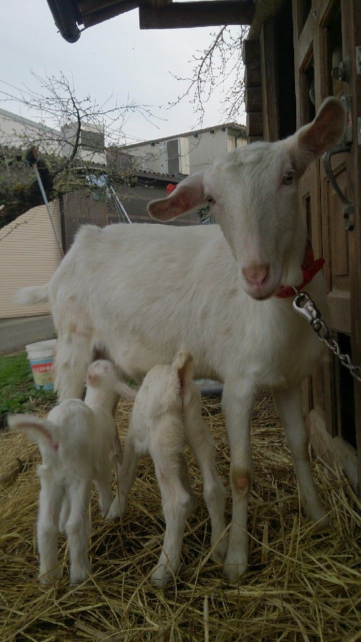 子やぎ兄妹4月16日が出産予定日だったやぎのたんぽぽちゃん、1日過ぎた17日の朝から兆候がみえたもののなかなか産まれず足が見えたり引っ込んだり...