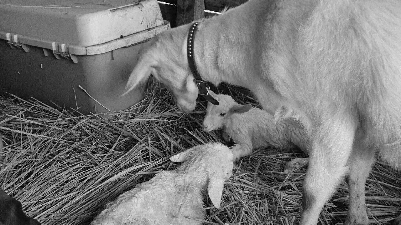 子やぎ誕生 いつものいきものがかりのお父ちゃんが案じながらもでかけてしまい、私もご飯の支度に家に入ったお昼時。