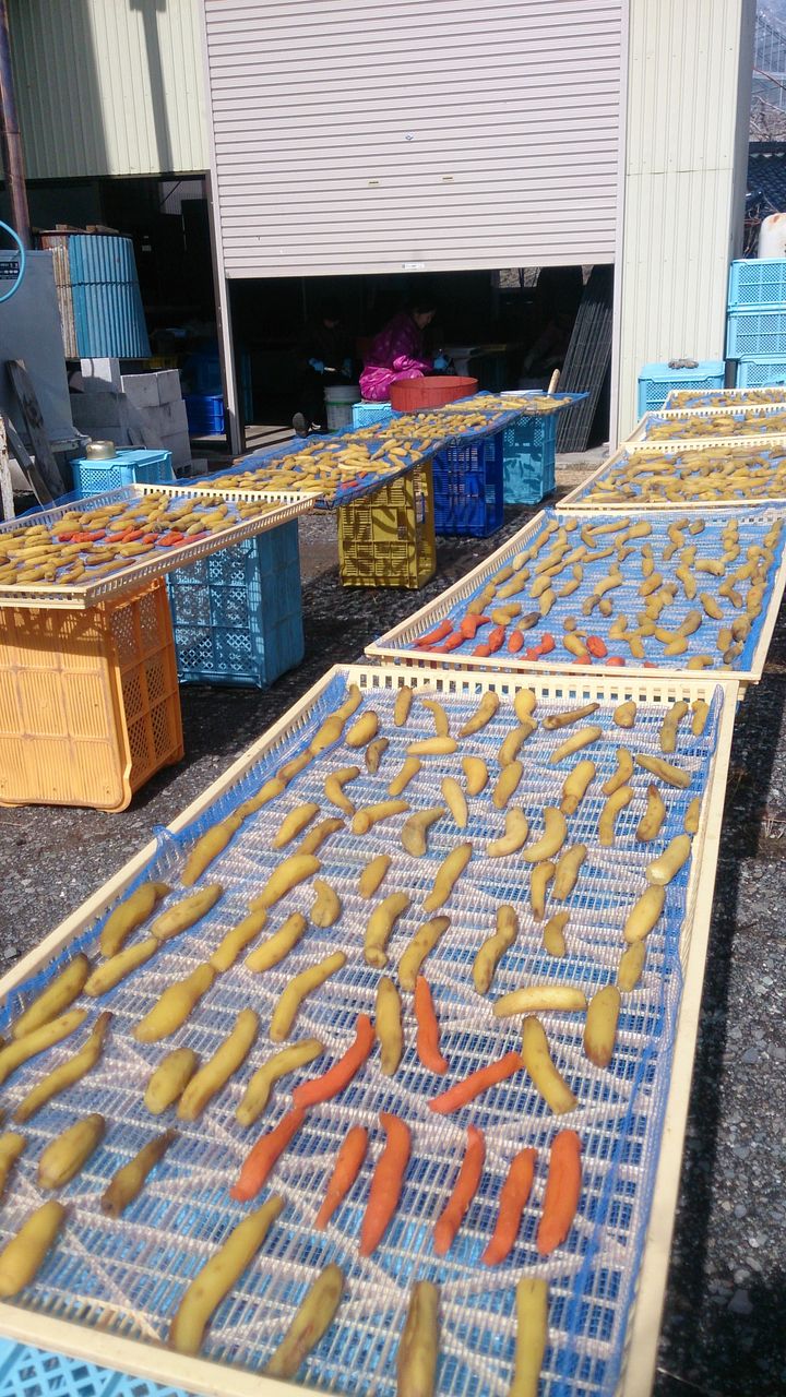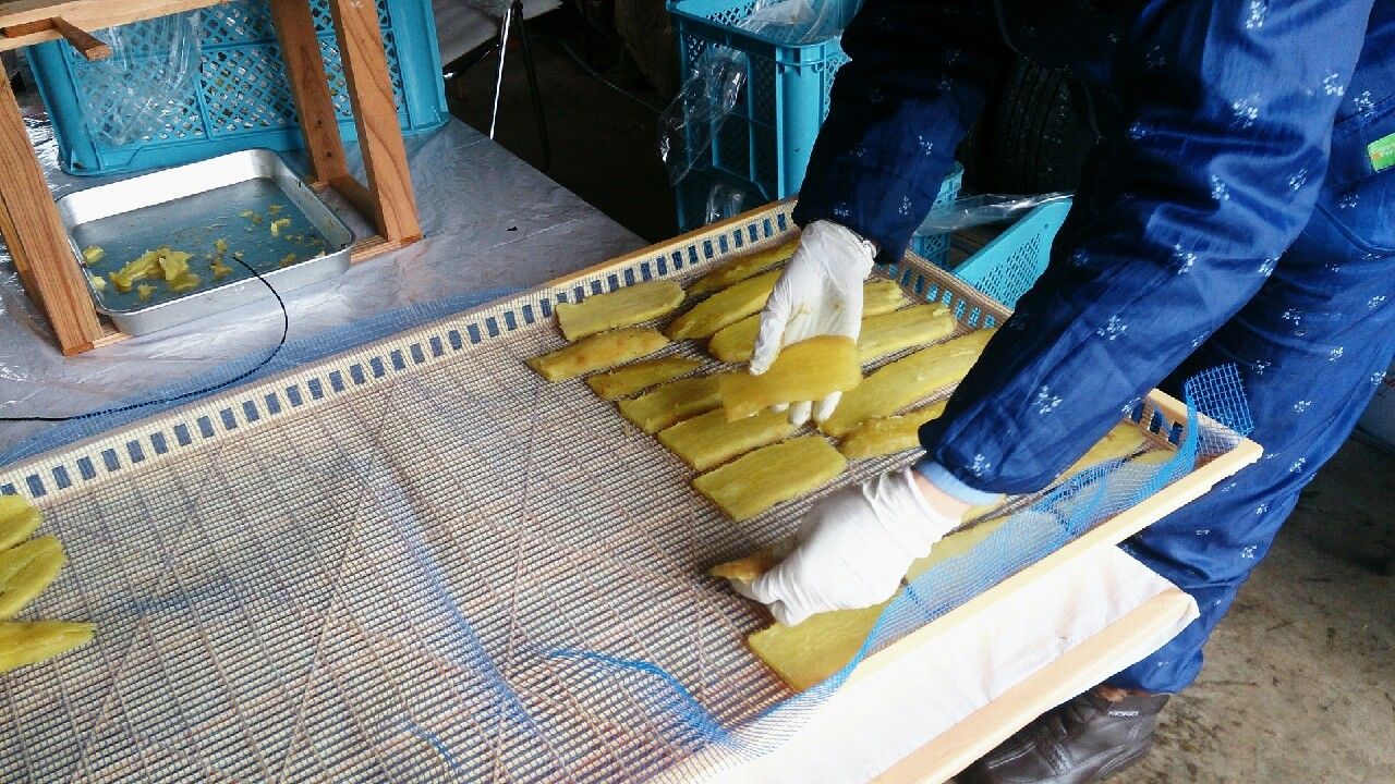 イモを並べて干します。以前はこのまま外で干していましたが昨年から乾燥機に一晩入れて水分をとばします。その方が仕上がりの色がきれいです。