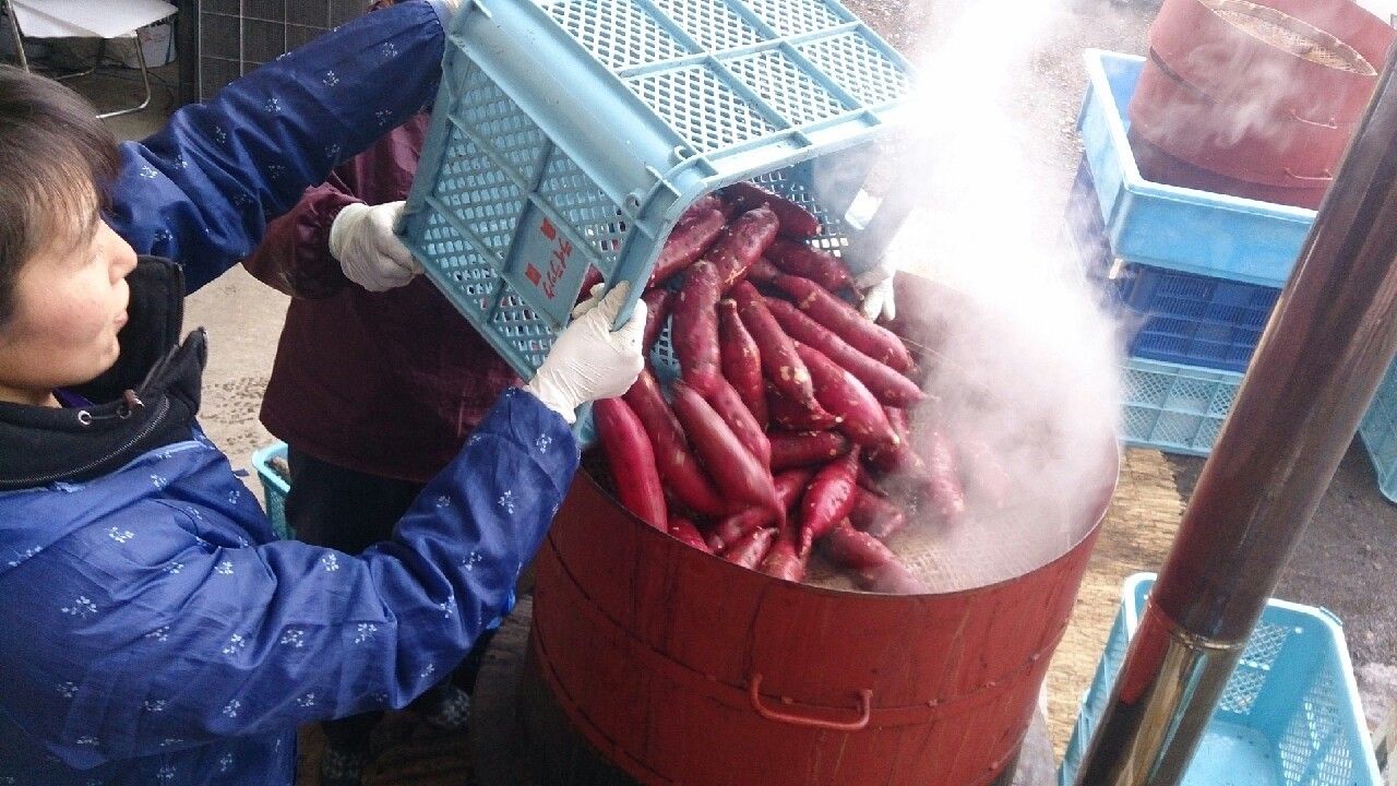 イモ投入前日に洗ってあったサツマイモを特注の蒸かし器に入れて三段重ねで2時間ほど蒸かします。