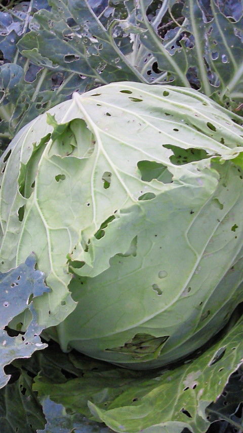 NEC_0977キャベツは蝶々が乱舞していましたが今は青虫に世代交代、素晴らしい穴あき具合です。