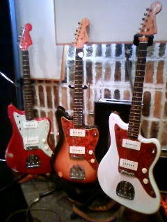 写真はライブでは使わないけどレコーディングで使っているジャズマスター達(ライブは湿気や温度やぶつけたりや盗難が怖いので)。右から61年製白、64年製サンバースト、64年製キャンディアップルレッド。ギターはひとつひとつ個体差があって音が違うので曲や他のメンバーの音に合わせて使いわけている。というのは建て前でただ自慢したかっただけの写真になってしまったようだが実はそのとおり。でもひとつひとつ個体差があって音が違うので曲や他のメンバーの音に合わせて使いわけているというのは本当だけど。いやージャズマスターはまじでいいね!見た目がいいよね!音も最高にいいね!!