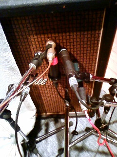 MICROPHONEそしてキャビネットに設置されたマイク。よく見ると5本立てられている。これとは別にアンビエントと呼ばれる、アンプ直ではなく部屋の真ん中に置かれた、いわゆる部屋鳴りと呼ばれる音を録音するマイクがさらに2本立てられている。どれも何十万もするもの。今回本当にびっくりしたのだけど、マイクによってチャンネルが分けられていて、どのマイクがいい?と聴かされるそのどれもが本当に全然違う音だった、素人耳に明らかにまったく違う。曙と千代の富士のルックスくらい違う。アンプから出ている音は同じなのにマイクでこんなにも違うのか!!そりゃエンジニアはこだわる訳だ...。と。考えてみると、電気信号を空気の振動に変えるのがスピーカーで、そのまったく逆に振動を電気信号に変えるのがマイクな訳だから、そりゃマイクによってローの出方やカラーはまったく変わるのは当然な訳だけど...ここまでとは...。目から鱗が落ちまくった。(ちなみに構造的にはマイクとスピーカーはまったく同じ原理で、スピーカーはマイクとしても使えるしその逆もつかえるのだ!!)