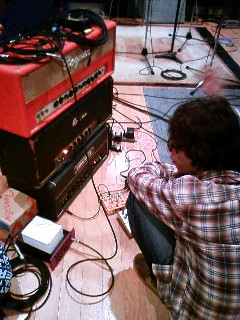 AMP N' YAMANDA下からHIWATT、マーシャル、ボグナーの改造マーシャルの三段積みに激しくお世話になったヤマンダ氏。これからやがて関係者大絶賛となるギターソロを弾こうか!という直前の姿。若干疲労の影が見えるが...?