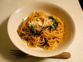 微塵切りにしたにんにくをオリーブオイルで炒め、ナンプラーを加えて炒めた後そこに牛乳を投入し煮詰める〈料理本なんかで生クリームと書いている部分は牛乳を煮詰めてちょっとバターを加えれば代用出来るぞ!〉、そして塩胡椒醤油雲丹茹でたほうれん草パルメザンチーズバターを投入し、茹であがったスパゲッティを和えるだけ。ちなみにこういうクリーム系のスパゲッティの時はアルデンテより少し柔らかめに茹でた方がソースとの馴染みが良い気がする。