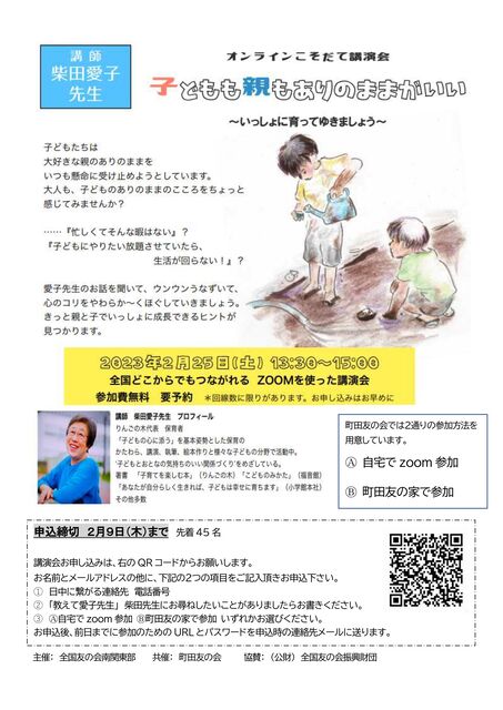 2月25日、柴田愛子先生のオンラインこそだて講演会 どなたでもご参加いただけます!