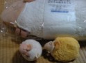 狭いベットにこのほかにも、白いプルートの人形・顔だけのたれパンダの抱き枕・サンタうさぎ・大きな牛の人形・などがあって、どれもホコリアレルギーの私に配慮されたタオル地だったりすべすべだったりする素材のものです
