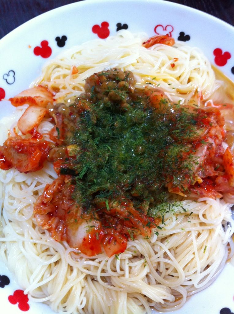 お皿に盛ったパスタに納豆、そしてキムチをのせる