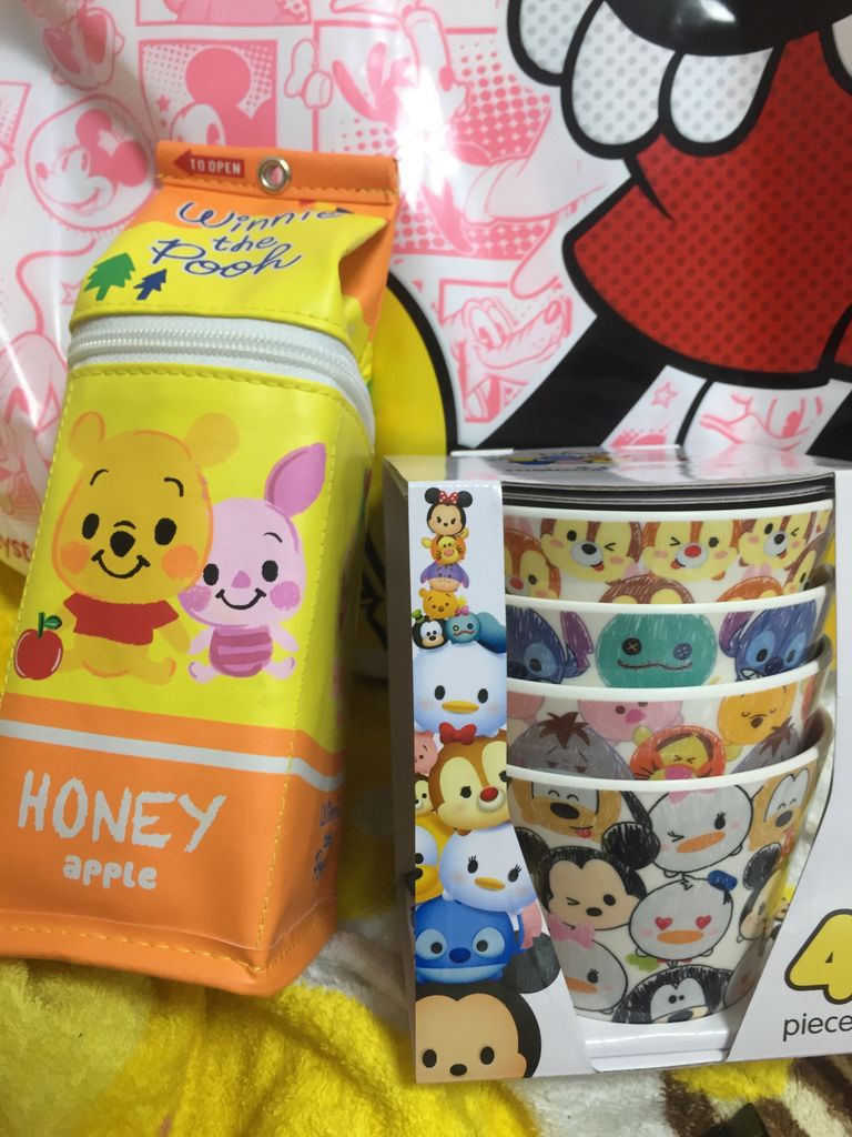 ヨーグルトとか入れて食べようと思ってるディズニーつむつむのボールと、牛乳パックみたいな筆箱